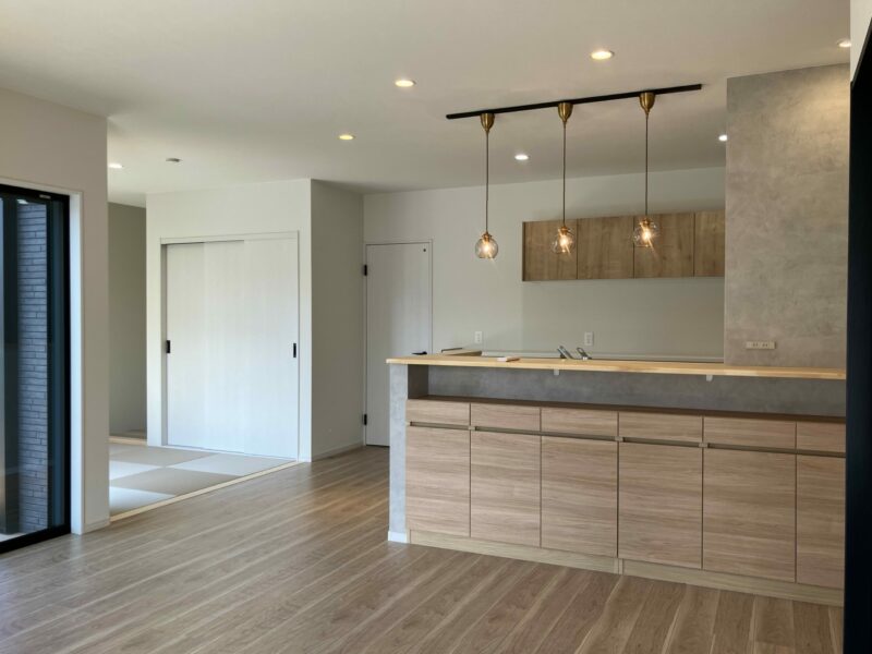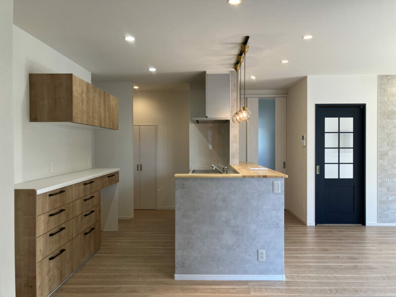 キッチン収納の取手やネイビーのドア、リビングに貼られたエコカラット。
